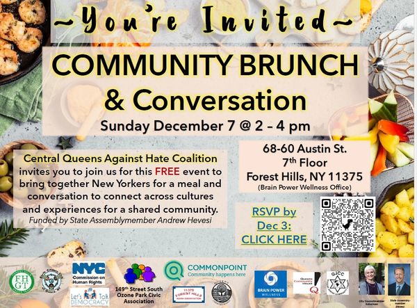 Community Brunch & Conversation on Sunday, Dec. 7th 2025, 2PM-4PM. 68-60 Austin Street, 7th Floor, Forest Hills, NY 11375